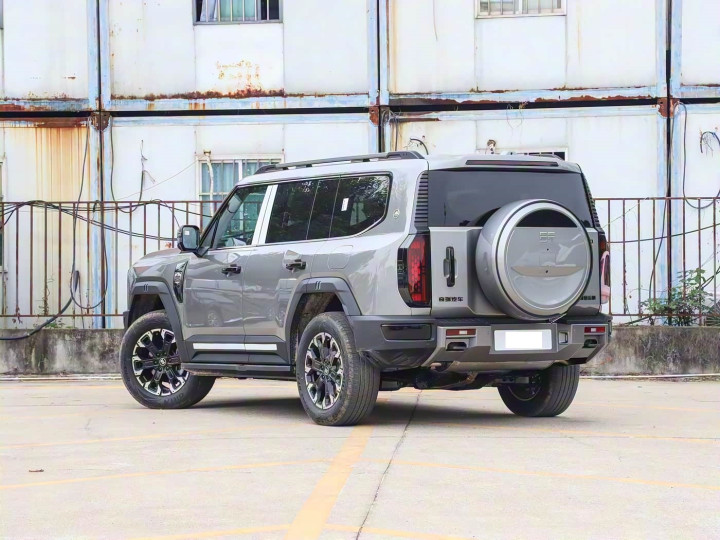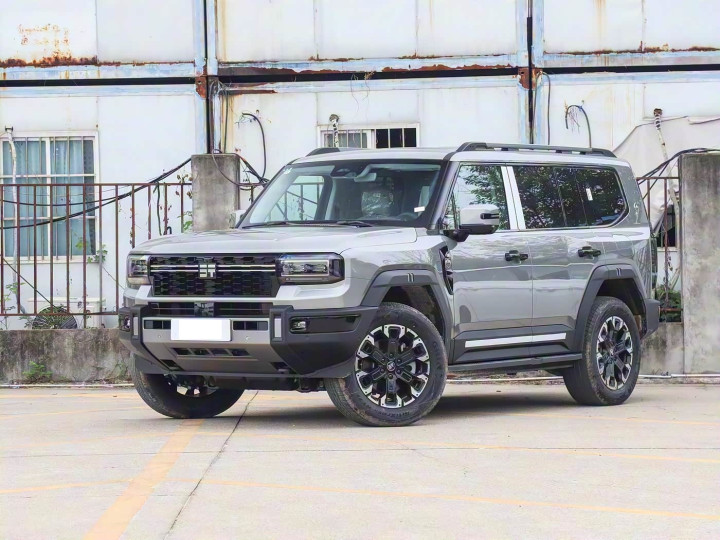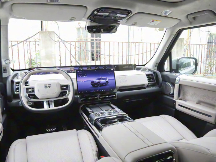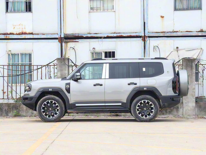 再来看车身侧面部分,侧面轮廓堪称“移动堡垒”,5198mm车长与2050mm车宽营造出压迫感。悬浮式车顶搭配20英寸高扁平比AT轮胎,轮眉灯采用独特竖形设计。A柱底部的拓展接口可加装射灯,侧裙防擦条与铆钉装饰进一步强化越野属性。轴距2870mm虽短于车身比例,但优化了纵向通过角,空气悬架支持230-320mm离地高度调节,兼顾城市与野外场景。